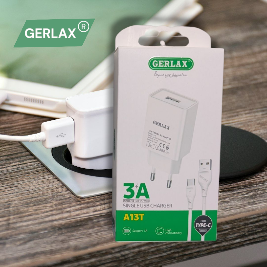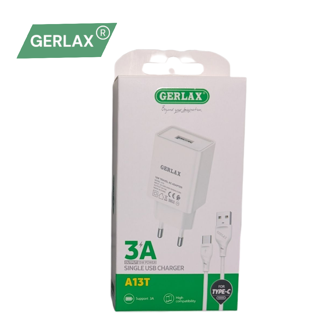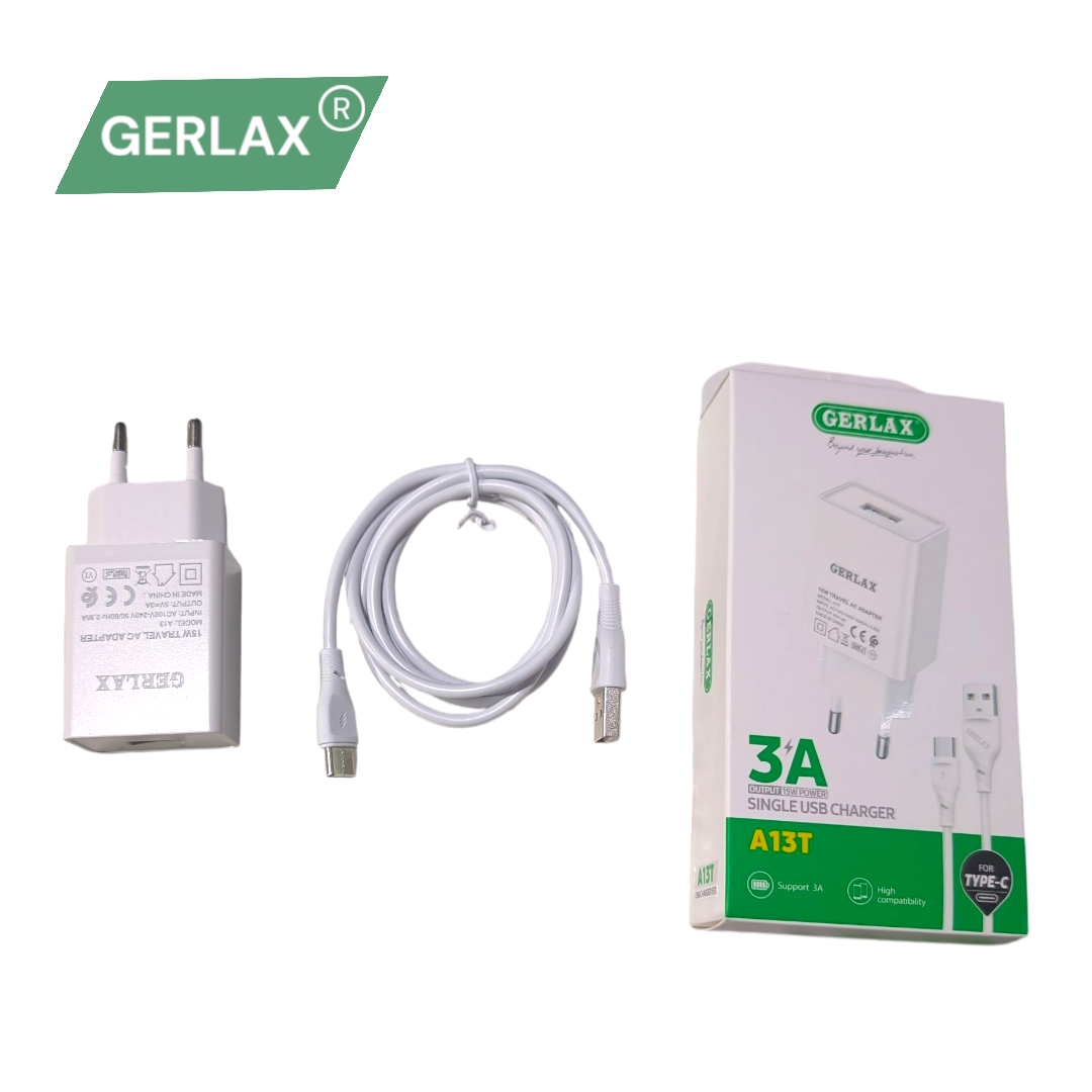 GERLAX A13T Original Charger & Type-C Cable – Full Speed Fast Charging, 100% Authentic! 3Amp