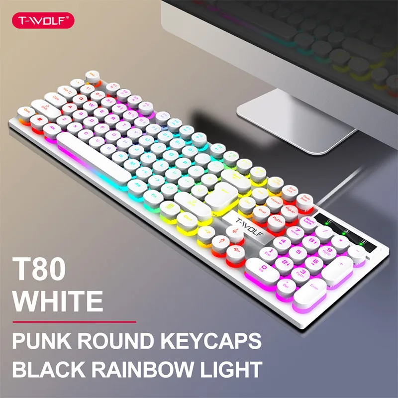 The T-WOLF T80 Gaming Keyboard brings a unique blend of vintage aesthetics and modern performance to your workspace or gaming setup. With its eye-catching pink punk retro design and character-transparent round keycaps, this keyboard redefines style while adding a touch of class to your desktop. Whether you’re a casual gamer or a professional, the T80 perfectly balances nostalgia and functionality, giving you a keyboard experience like no other.