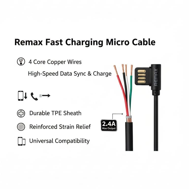Remax Branded Fast Charging Micro USB Data Cable – High Speed Charging & Sync Cable for Android Devices